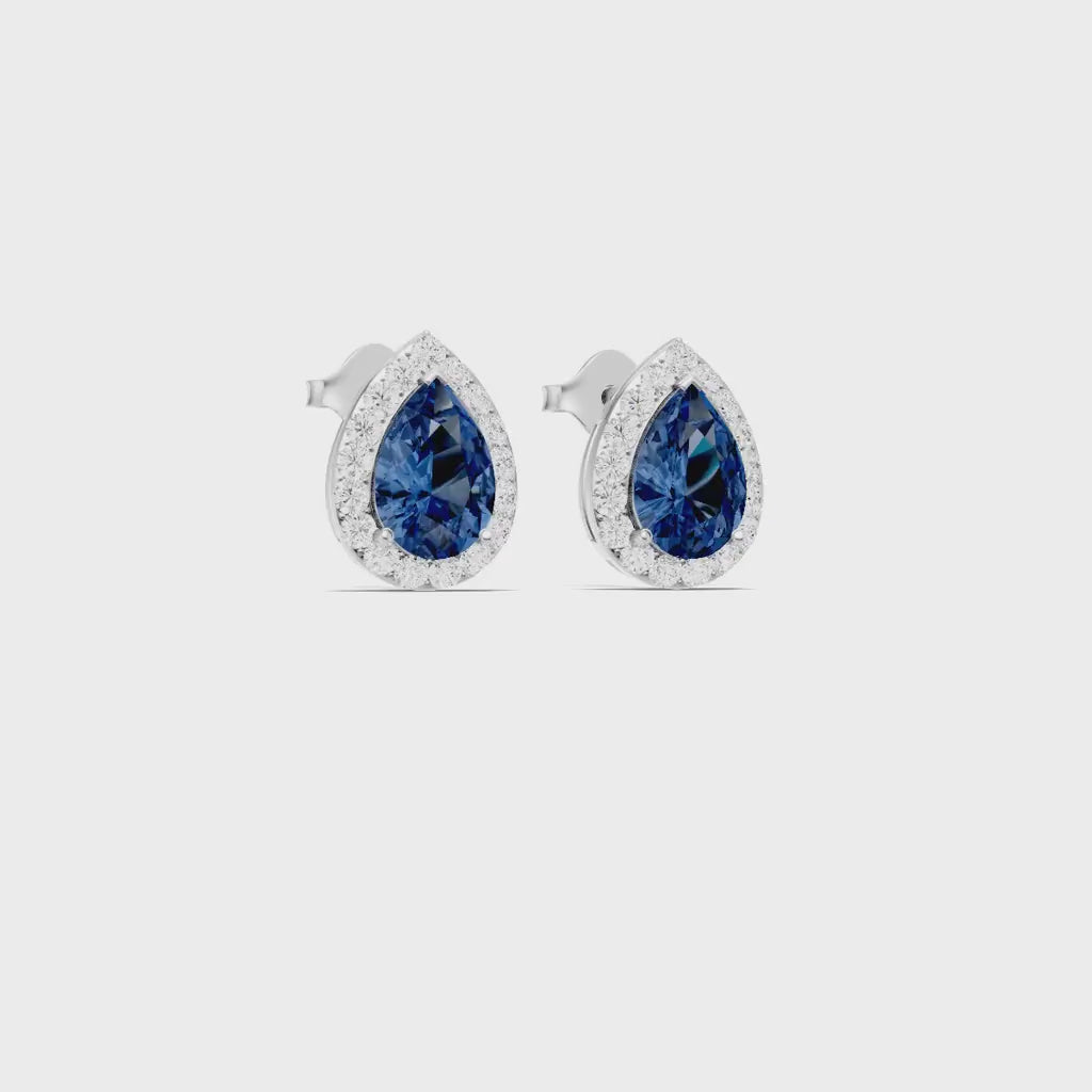 Blue Sapphire Pear Halo Studs Earrings - 6x4mm