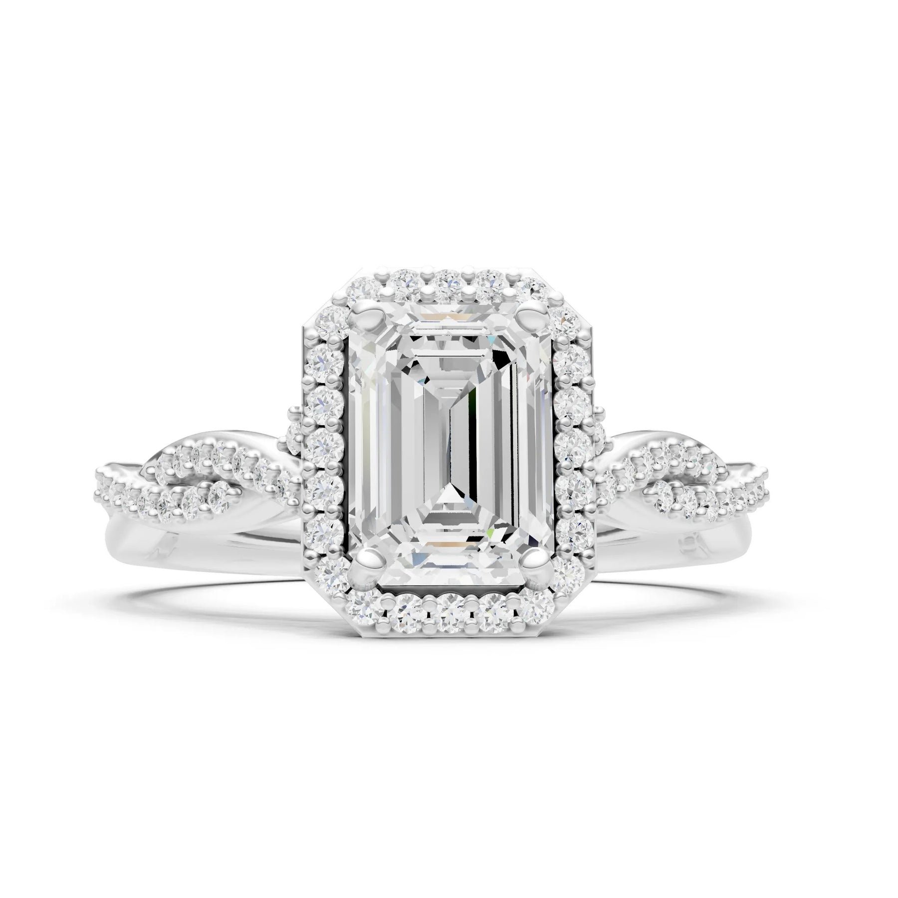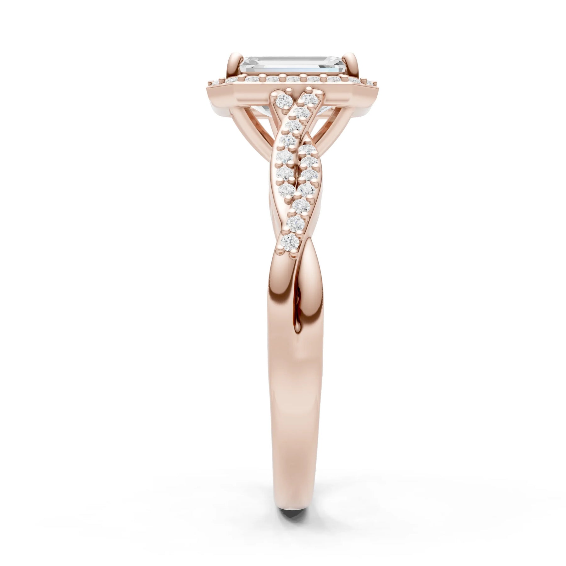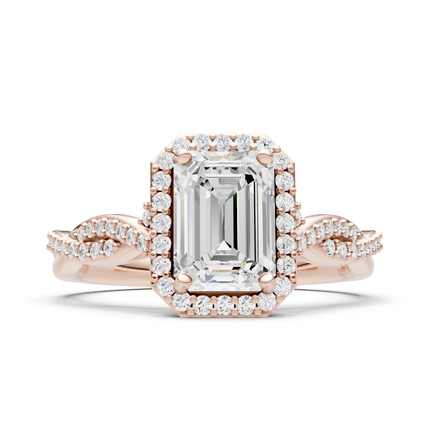 Moissanite Twisted Vine Solitaire Emerald Cut Halo Ring with Accent
