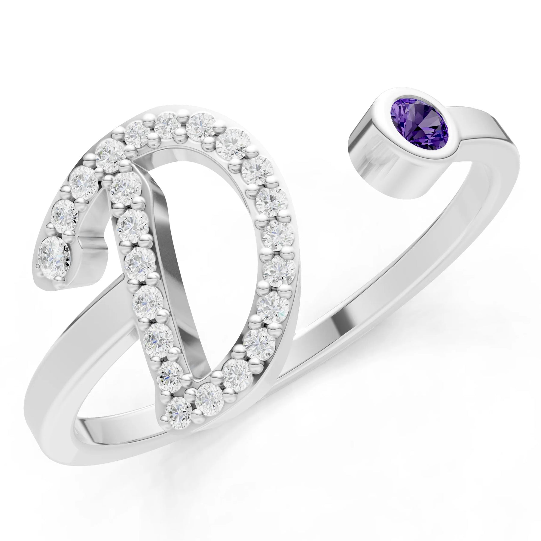 Amethyst Dainty Initial Letter Birthstone Open Ring – D