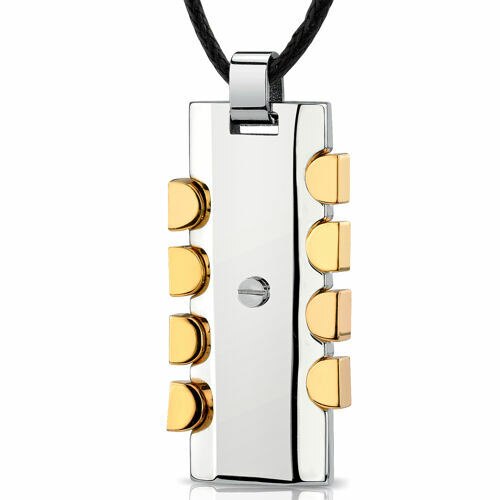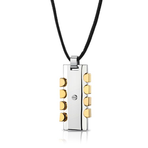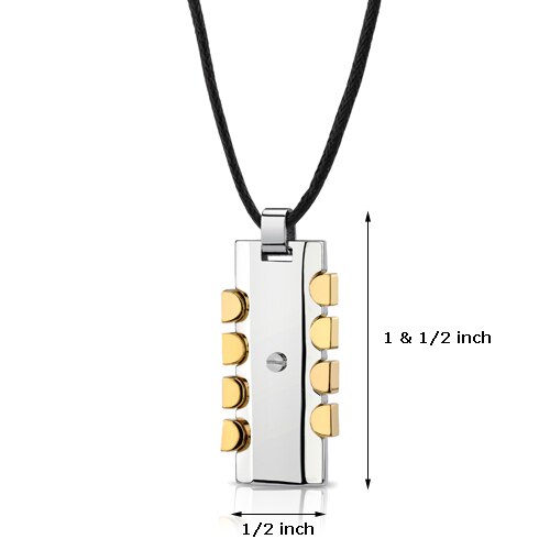 This Dynamic Unisex Stainless Steel Yellow Gold tone Screw Rivet design Dog Tag Pendant brings high fashion panache to every occasion. This elegant pendant comes fitted on a Black wax cord that can be adjusted. Dimensions: Length: 1 1/2 inches x Width: 1/2 inch.