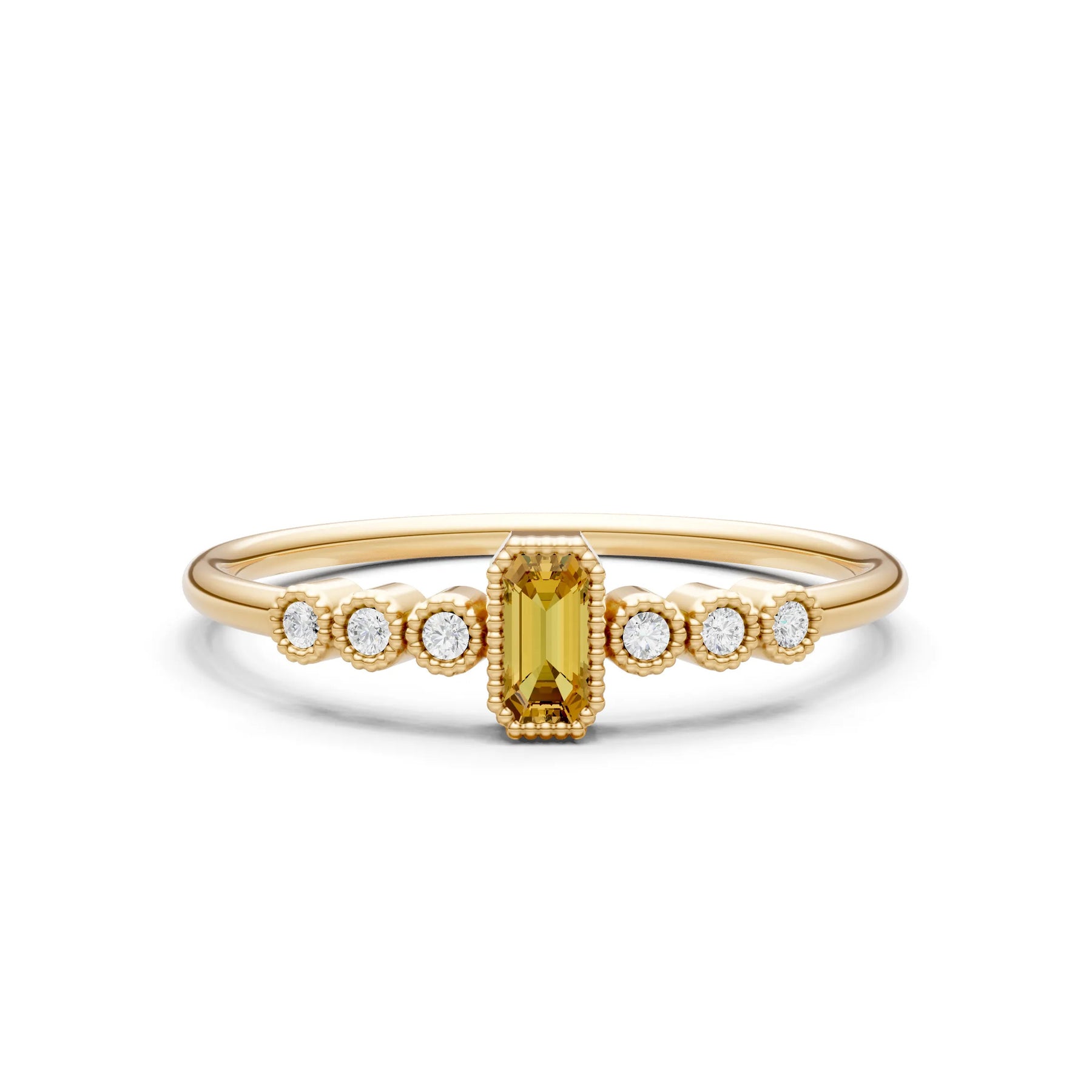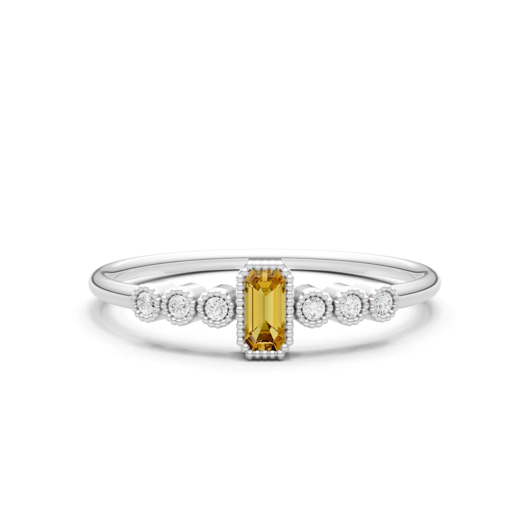 Transform your style with this stunning 14K White Gold Citrine ring featuring a striking emerald cut gemstone and delicate round accents. Crafted with precision and available in 10k, 14k, or 18k gold in your choice of White, Yellow, or Rose Gold, this piece reflects Peora’s commitment to quality craftsmanship. Every element of this ring, from its vibrant yellow VS1 clarity citrine to the thoughtful design, is a testament to Peora’s passion for creating jewelry that combines beauty and purpose. Each piece is responsibly sourced, ensuring you wear a symbol of luxury that tells a story of care and artistry. Arriving in a luxurious gift box, it’s perfect for gifting or safekeeping.