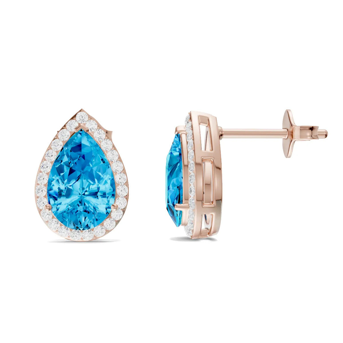 Swiss Blue Topaz Pear Halo Studs - 9x6mm
