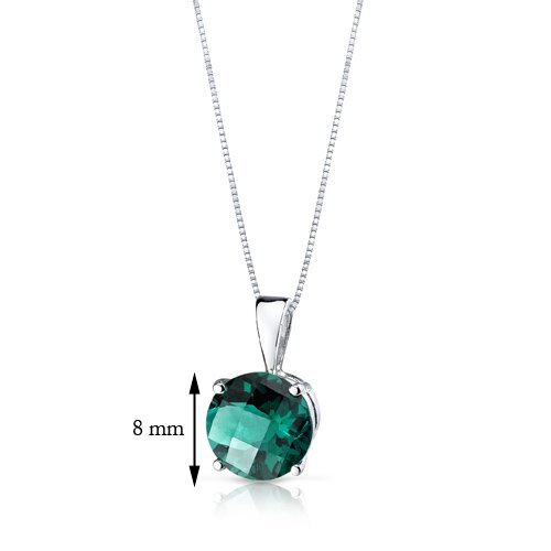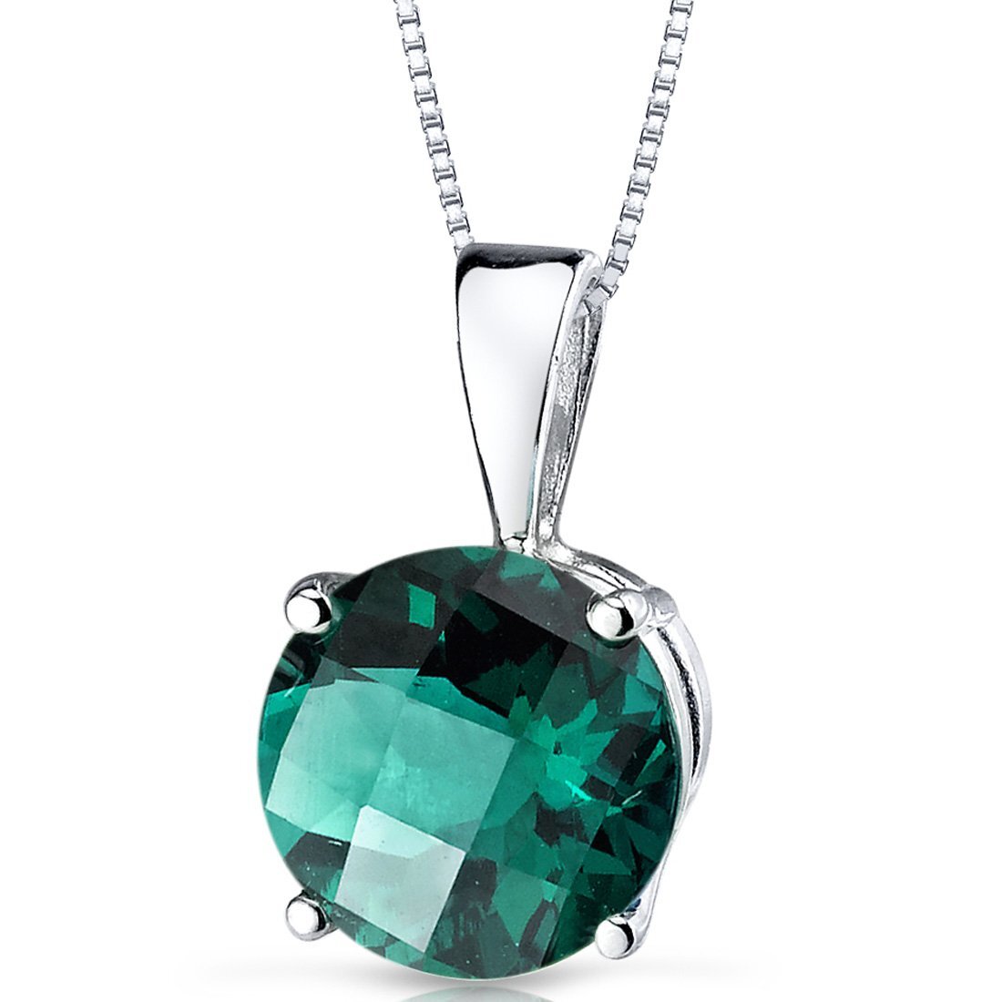 This graceful pendant features round shape Peora created Emerald gemstones in 14K white gold.