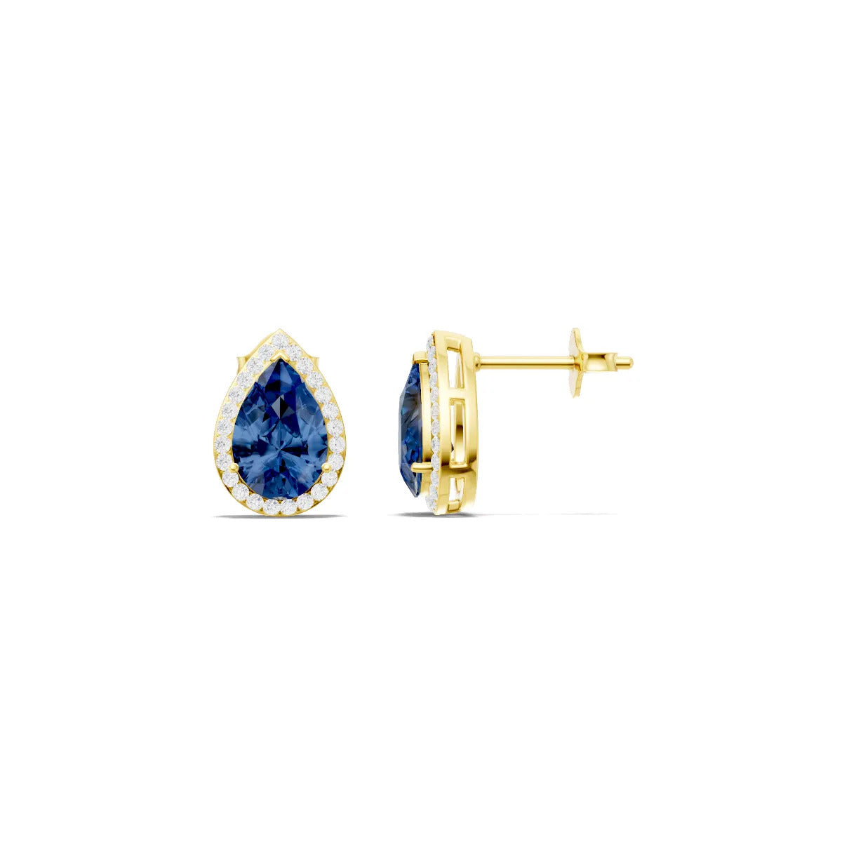 Blue Sapphire Pear Halo Studs - 9x6mm