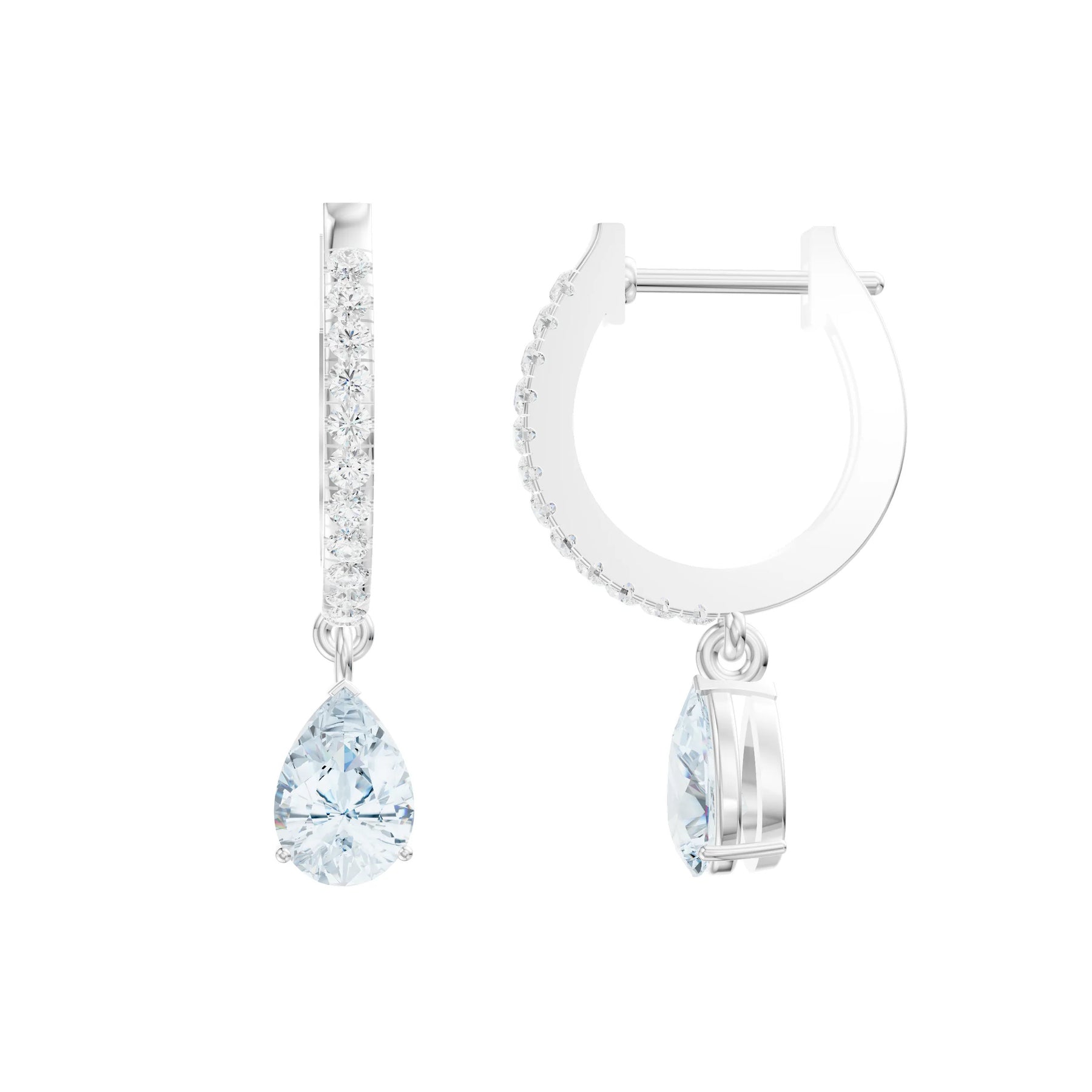 Aquamarine Gemstone Pear Shape Hoop Drop Earrings with Accents - 7x5mm
