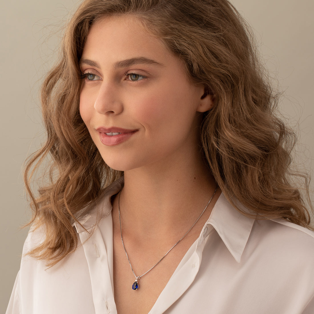 This standout pendant features pear shape Peora created Blue Sapphire gemstones in 14K white gold.