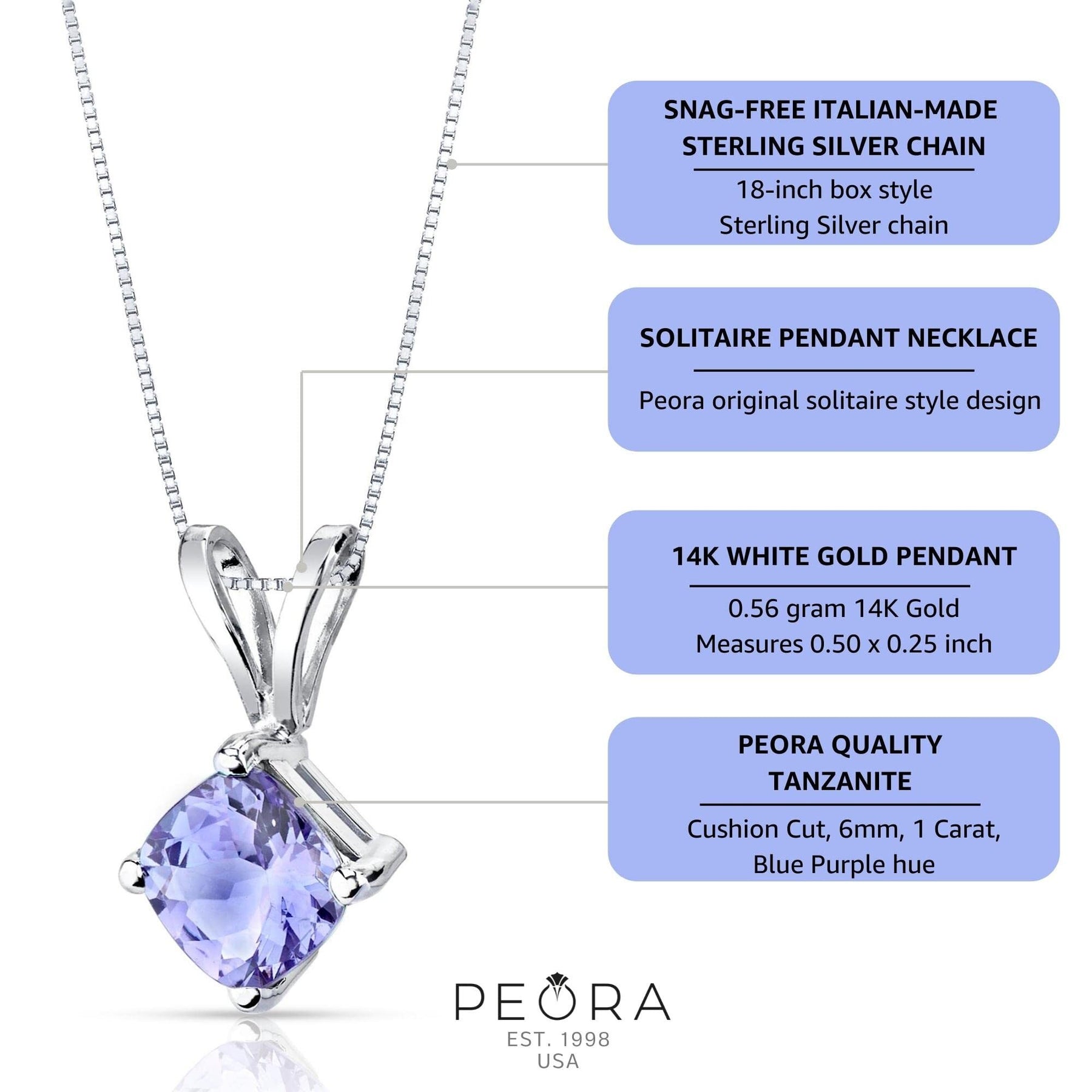 This versatile pendant features cushion cut Peora natural Tanzanite gemstones in 14K white gold.