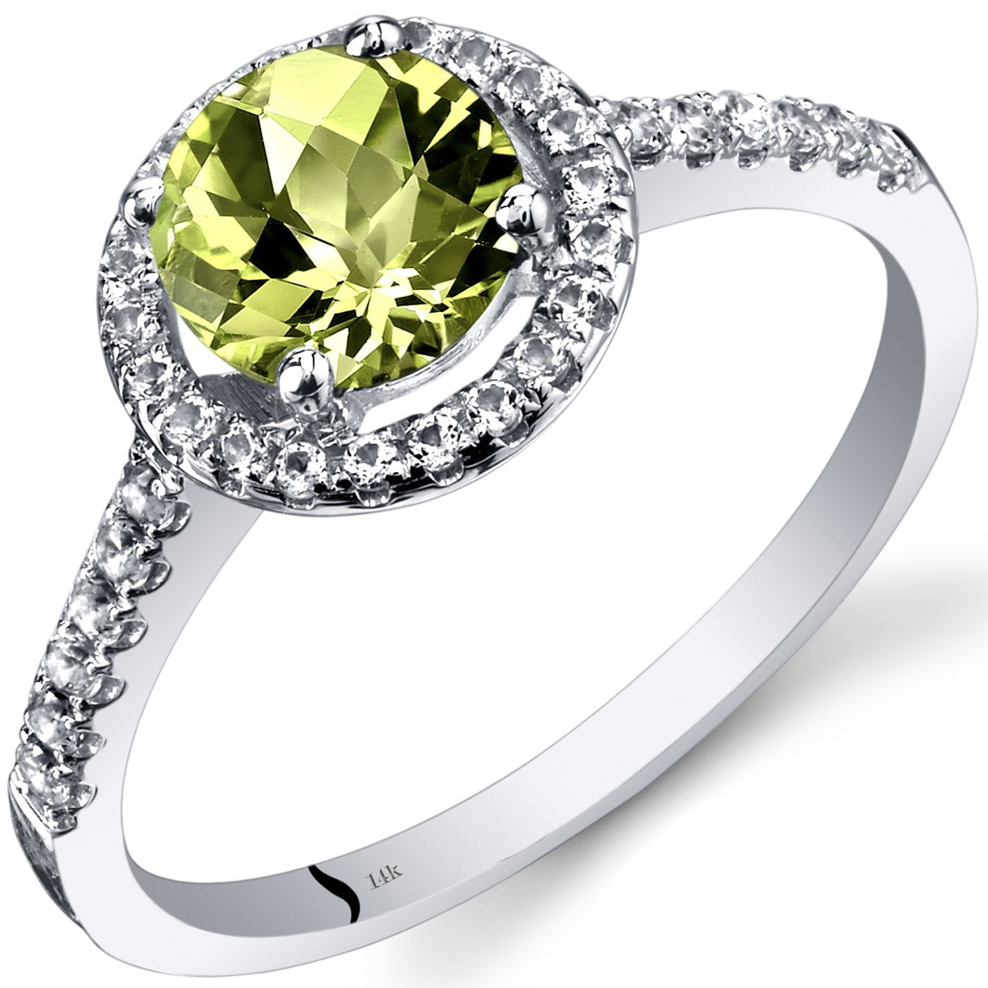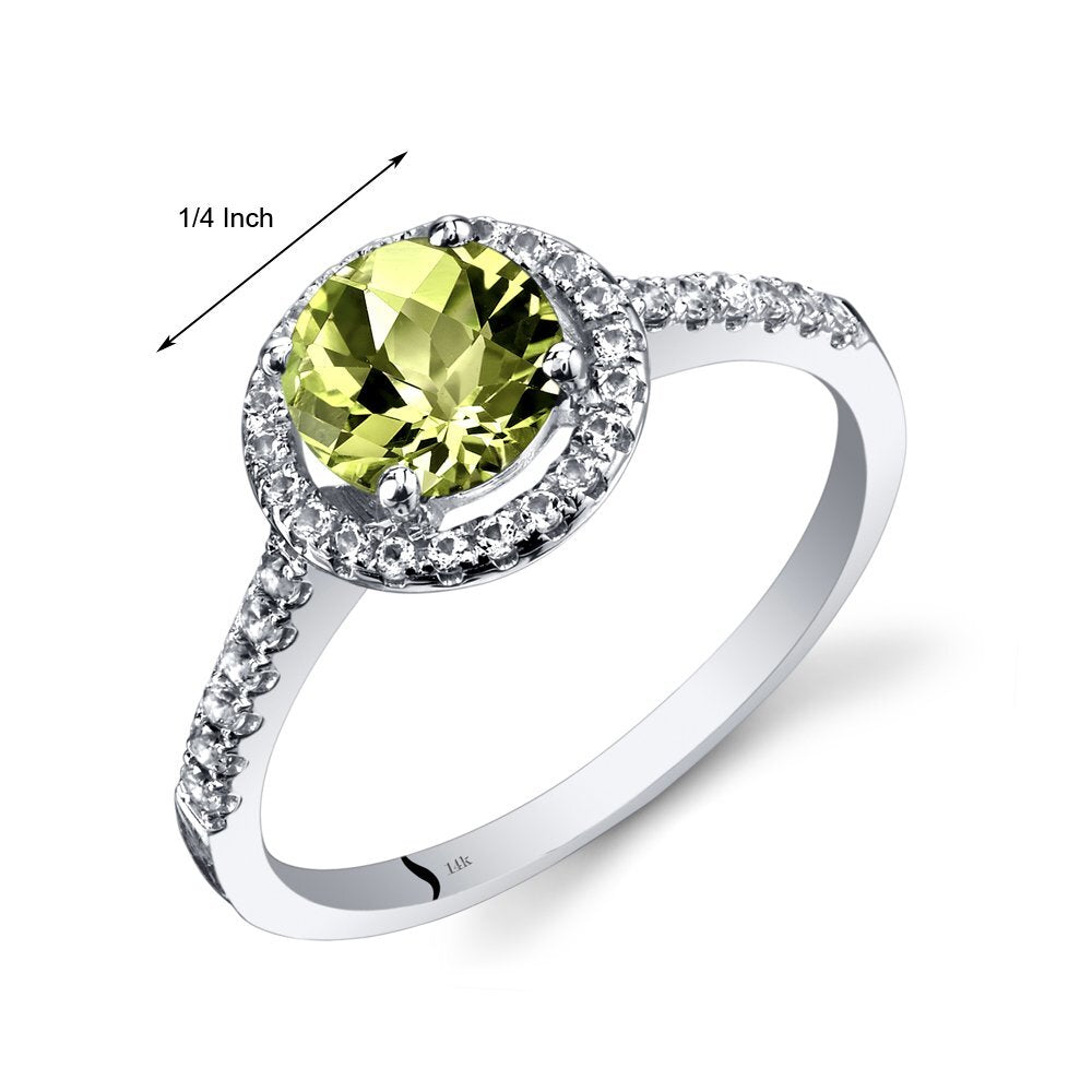 This classic Halo ring features a a round shape Peora natural Peridot gemstone in 14K white gold.