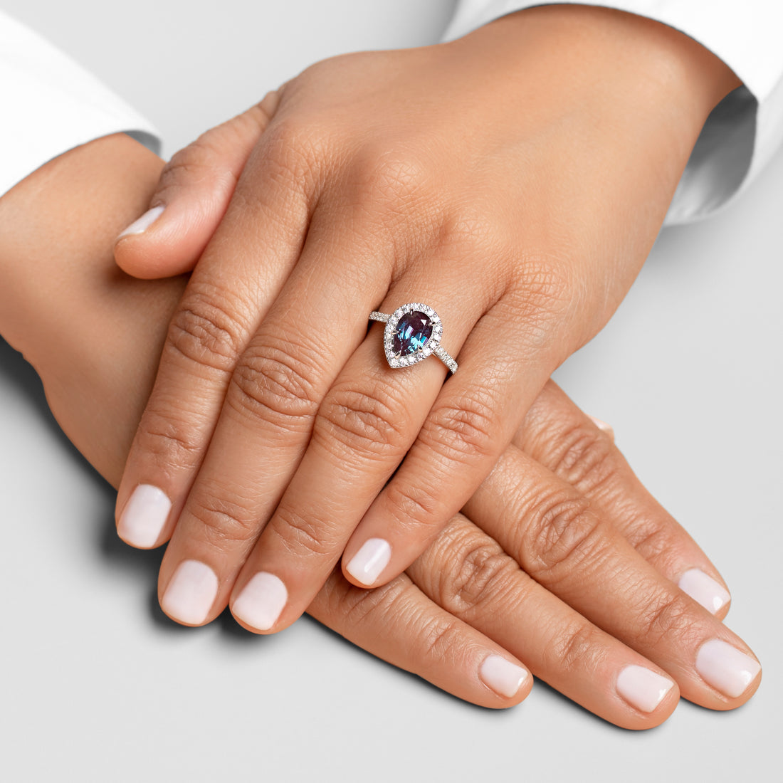 Celebrated for its color-changing charm, the created Alexandrite at the heart of this piece has distinct faceting that enhances the sparkle from every angle, reflecting a kaleidoscope of color that shimmers from blue to purple. It is surrounded by meticulously cut and polished lab grown diamonds that create a scintillating and luminous effect.