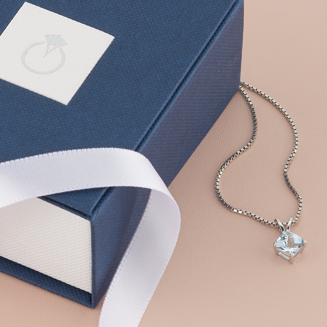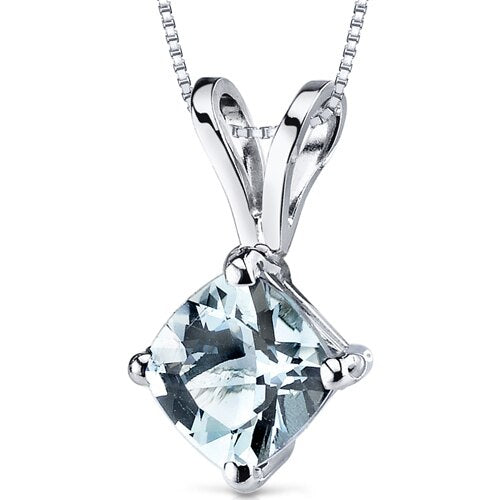This classic pendant features cushion cut Peora natural Aquamarine gemstones in 14K white gold.