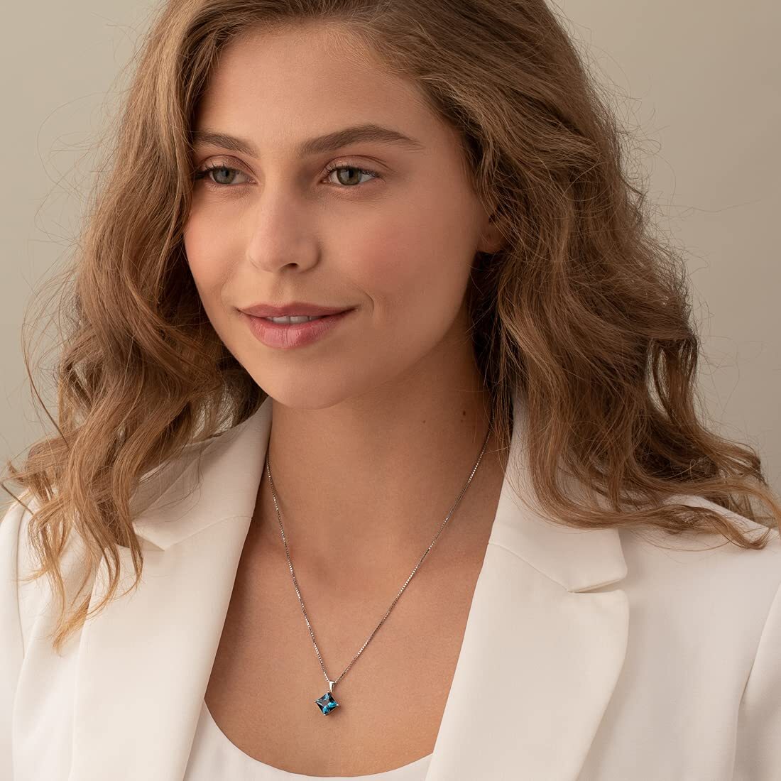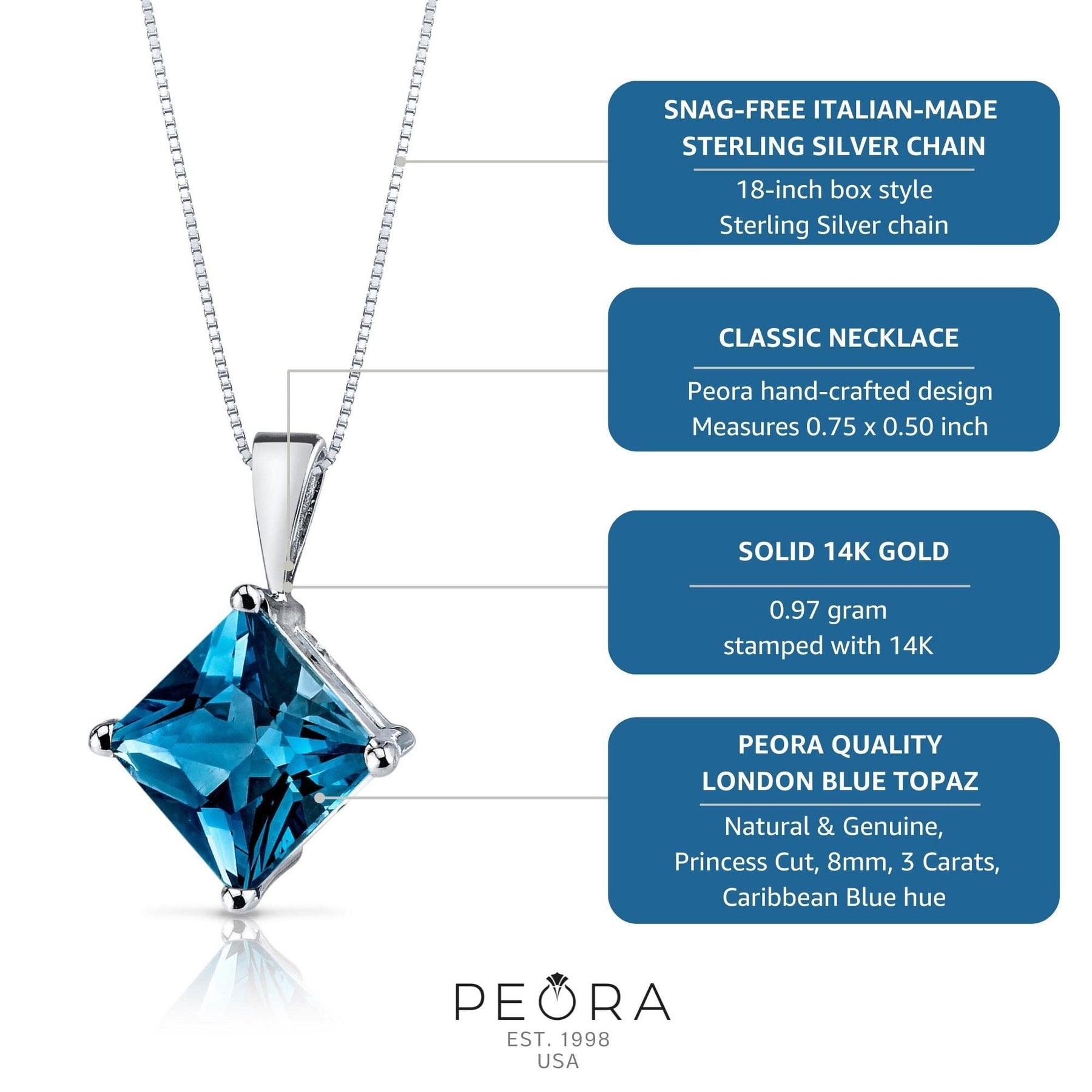 This classic pendant features princess shape Peora natural London Blue Topaz gemstones in 14K white gold.