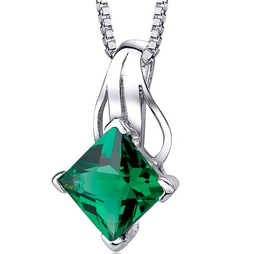 Emerald Pendant Necklace Sterling Silver Princess Cut 2 Carats