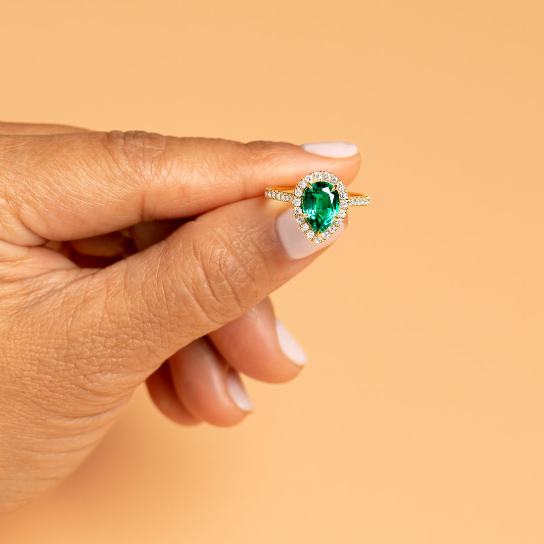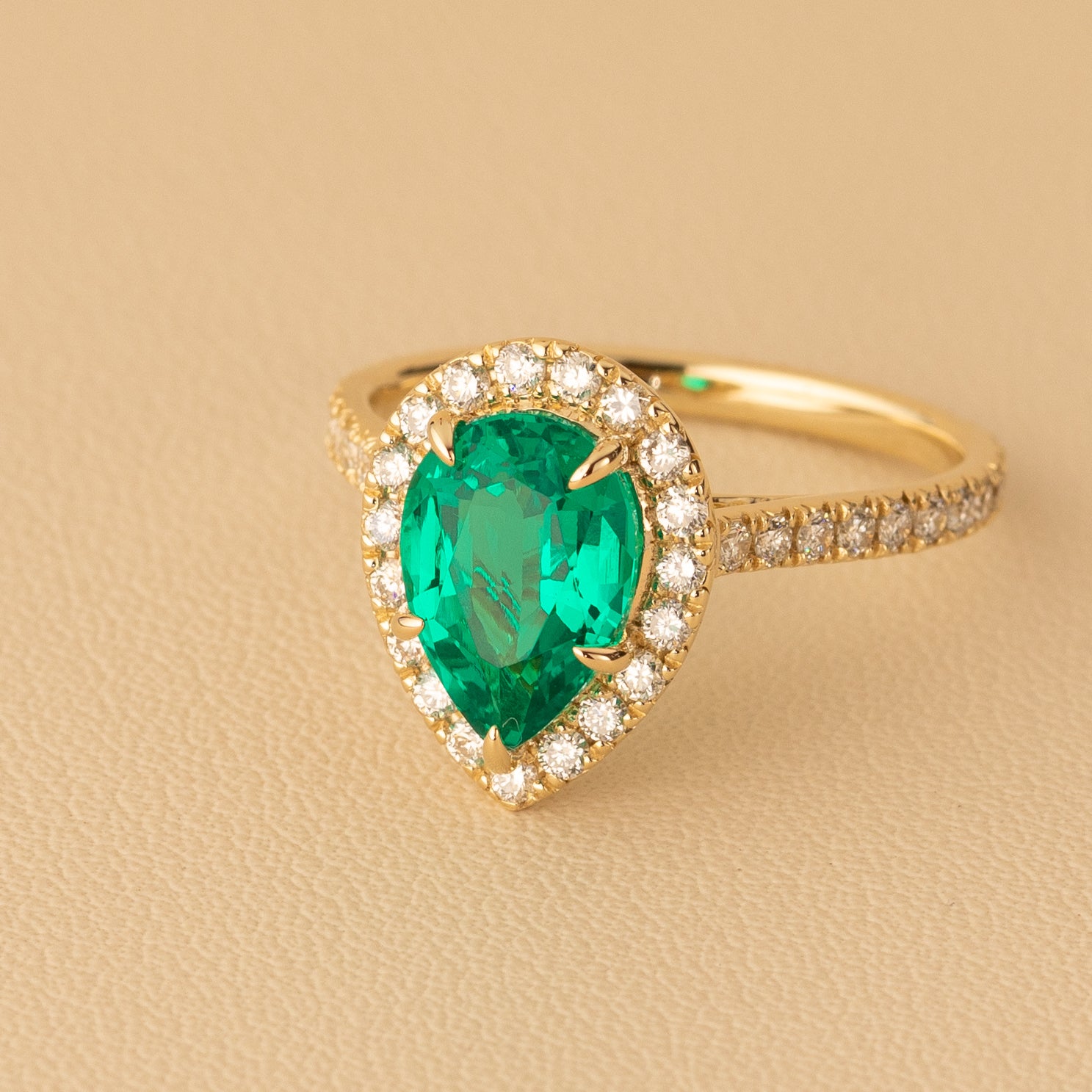 Peora Colombian Emerald Ring Pear Shape 14K Yellow Gold with Diamonds