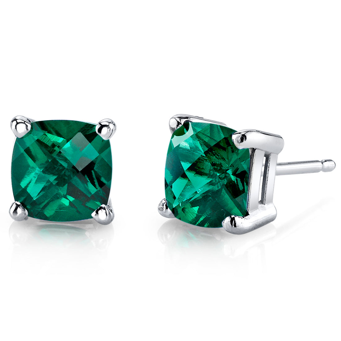 These classic earrings feature cushion cut Peora created emerald gemstones in 14K white gold.