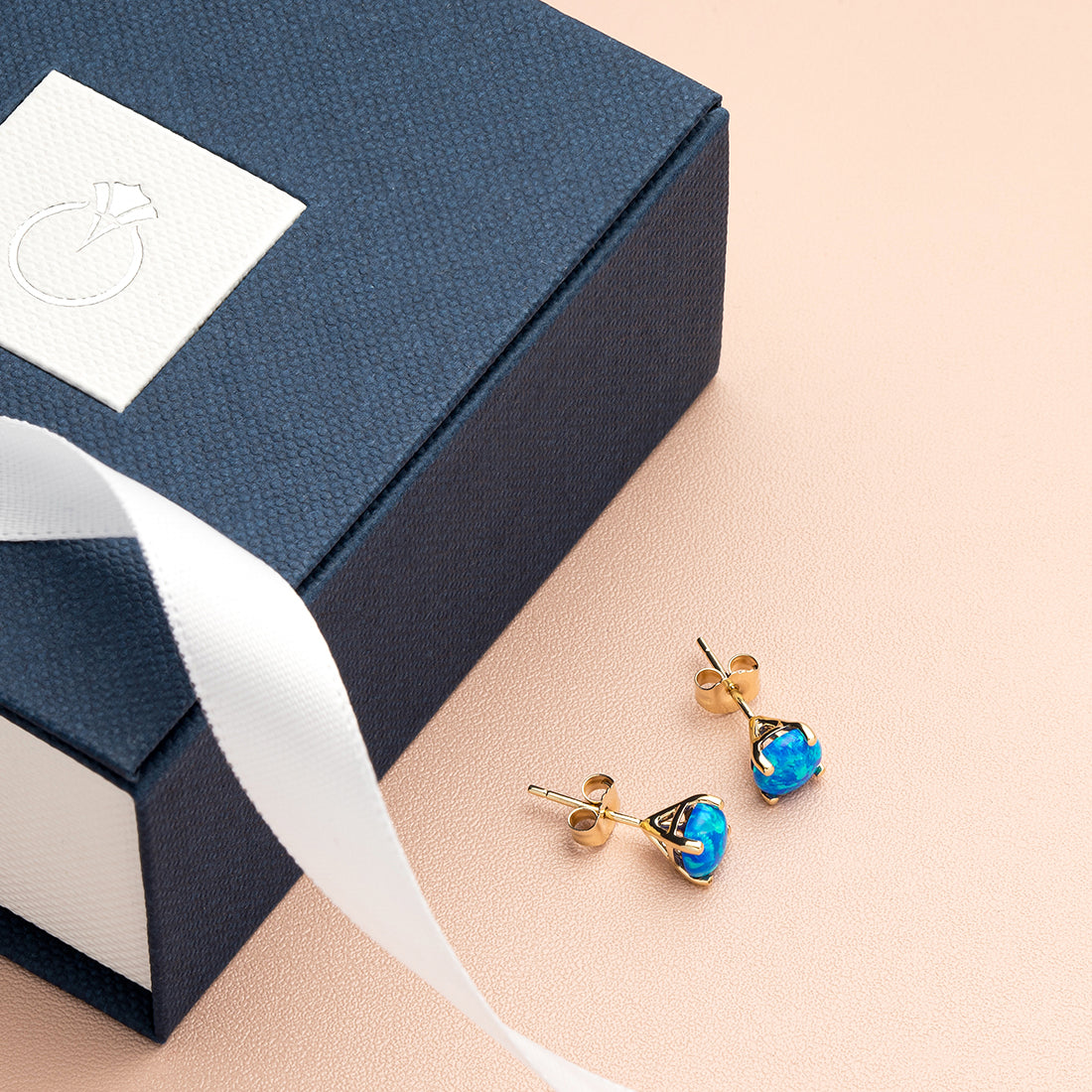 14K Yellow Gold Round Cut Created Blue Opal Stud Earrings E19142-giftbox