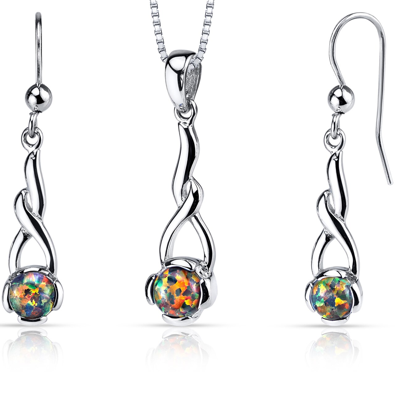 Featured Stone: 3 pieces Blazing Black Created Opal, Round-cut Cabochons sized at 6mm (1 piece, Pendant) & 5mm (2 pieces, earrings); 2.00 Carats Total Weight; Total Set Metal Weight: 3.5 grams Sterling Silver with .925 Stamp. Earring backs are Fish hook style. Enchant your October girl with a perfectly coordinated Created Blazing Black Opal Sterling Silver Earrings & Pendant Necklace Set, and to polish her lovely ensemble. Beautiful round-cut iridescent created Opals fashioned in dangling style in sleek sterling silver, with a helix design. Opal is October?s birthstone. It?s also a wonderful gift for just about any occasion such as Mother?s Day, Valentine?s Day, Graduation, Christmas, and Anniversaries. This is also an ideal gift for bridesmaids, flower girls, and other members of your wedding party. The earrings and Pendant Necklace set showcases an exquisite design with outstanding craftsmanship, and boasts a no-tarnish Rhodium finish. Signature gift box included with purchase. Style SS3946.