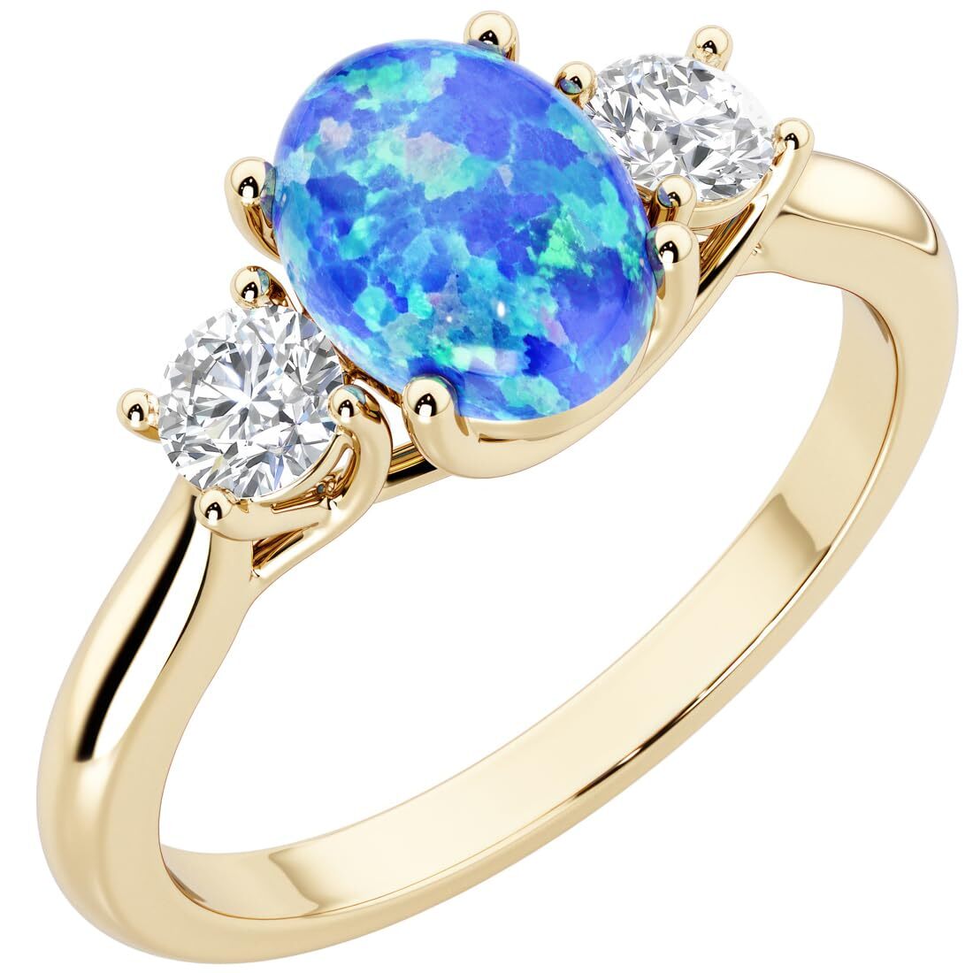 Blue Opal and Lab Grown Diamond 3-Stone Trellis Ring 14K Gold 1.30 Carats Oval