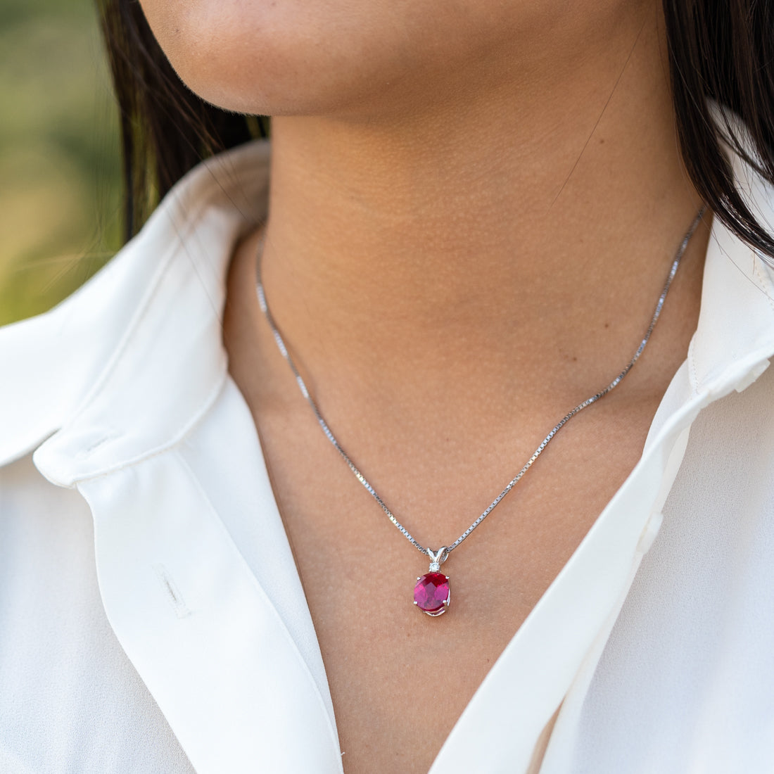 This graceful pendant features oval shape Peora created Ruby gemstones in 14K white gold.