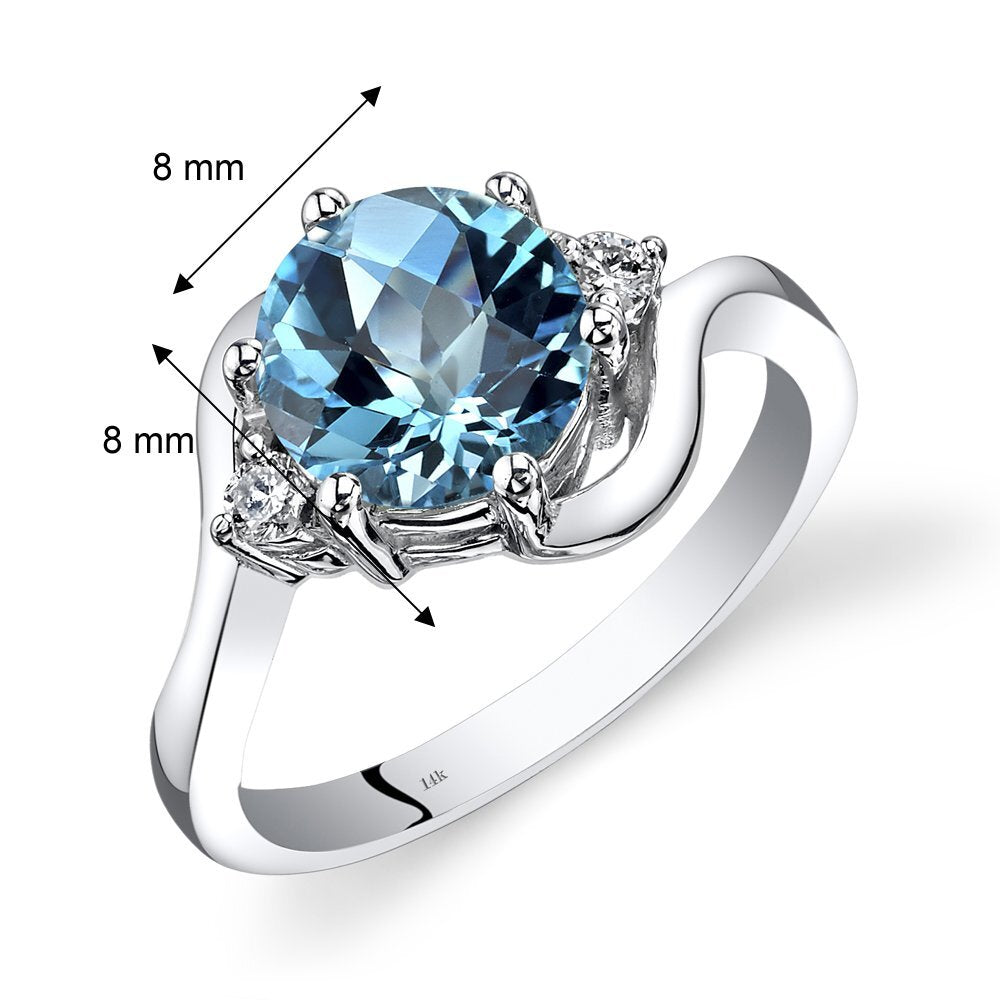 This graceful ring features a round shape Peora natural Swiss Blue Topaz gemstone in 14K white gold.