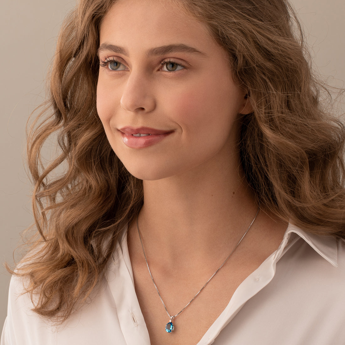 This classic pendant features oval shape Peora natural Swiss Blue Topaz gemstones in 14K white gold.