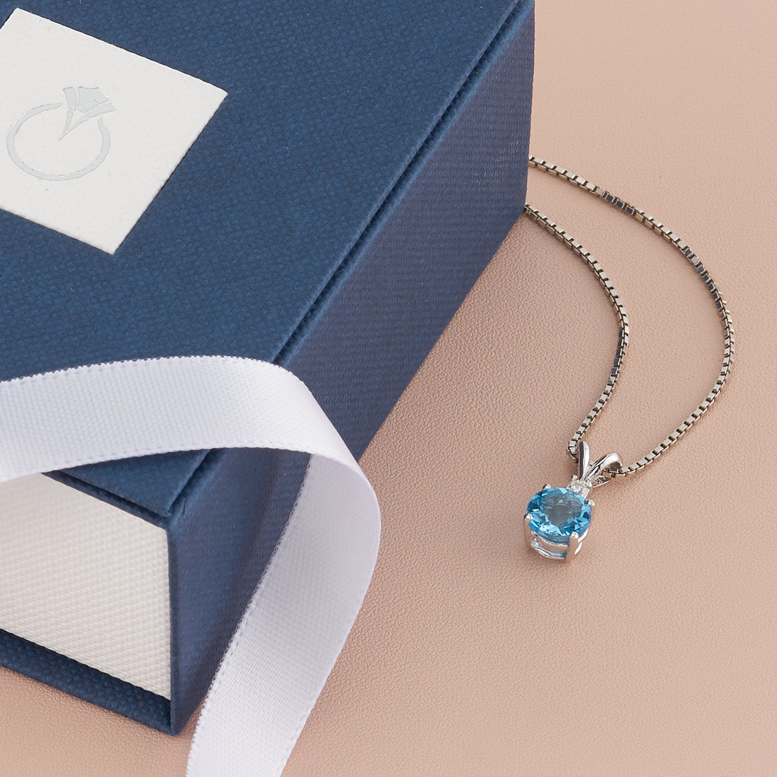 Video of 14 kt White Gold Round Cut 1.25 ct Swiss Blue Topaz Pendant P8972 by Peora Jewelry. Includes a Peora gift box. Free shipping, 30-day returns, authenticity guaranteed.