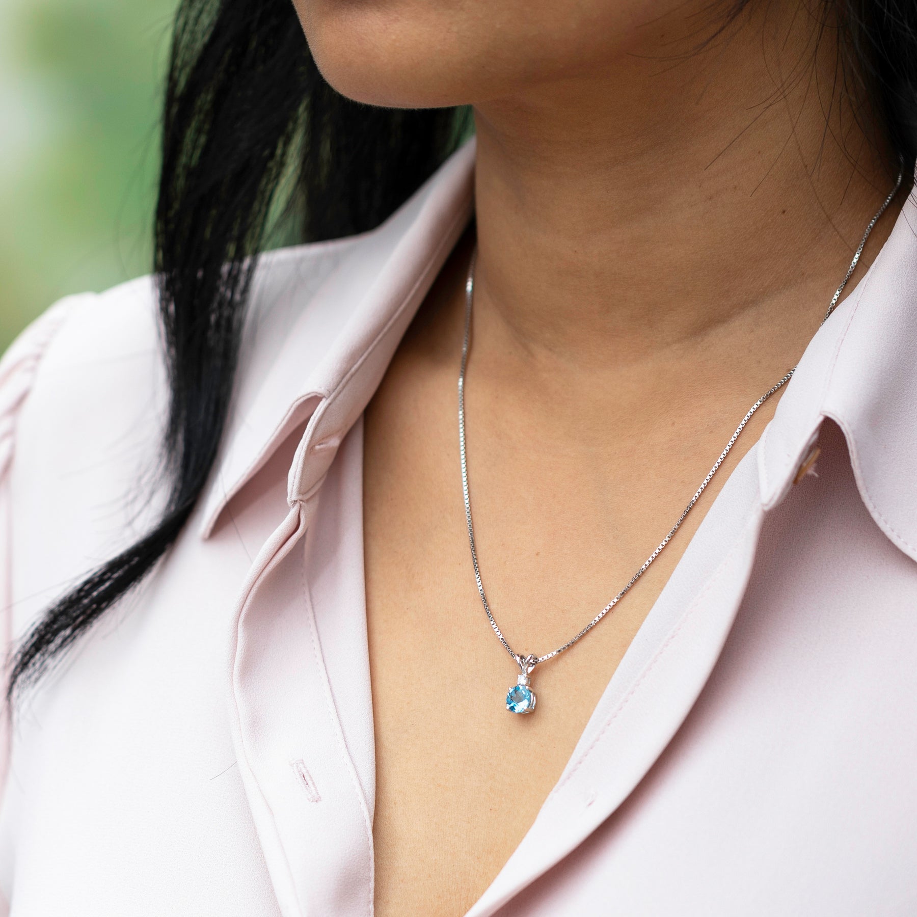 This standout pendant features round shape Peora natural Swiss Blue Topaz gemstones in 14K white gold.
