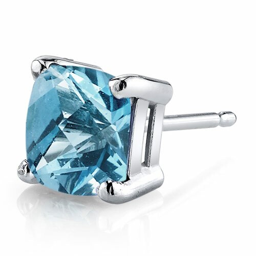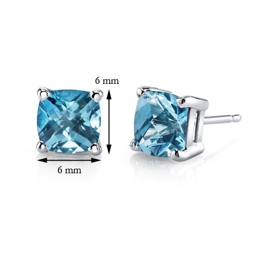 These classic earrings feature cushion cut Peora natural swiss blue topaz gemstones in 14K white gold.