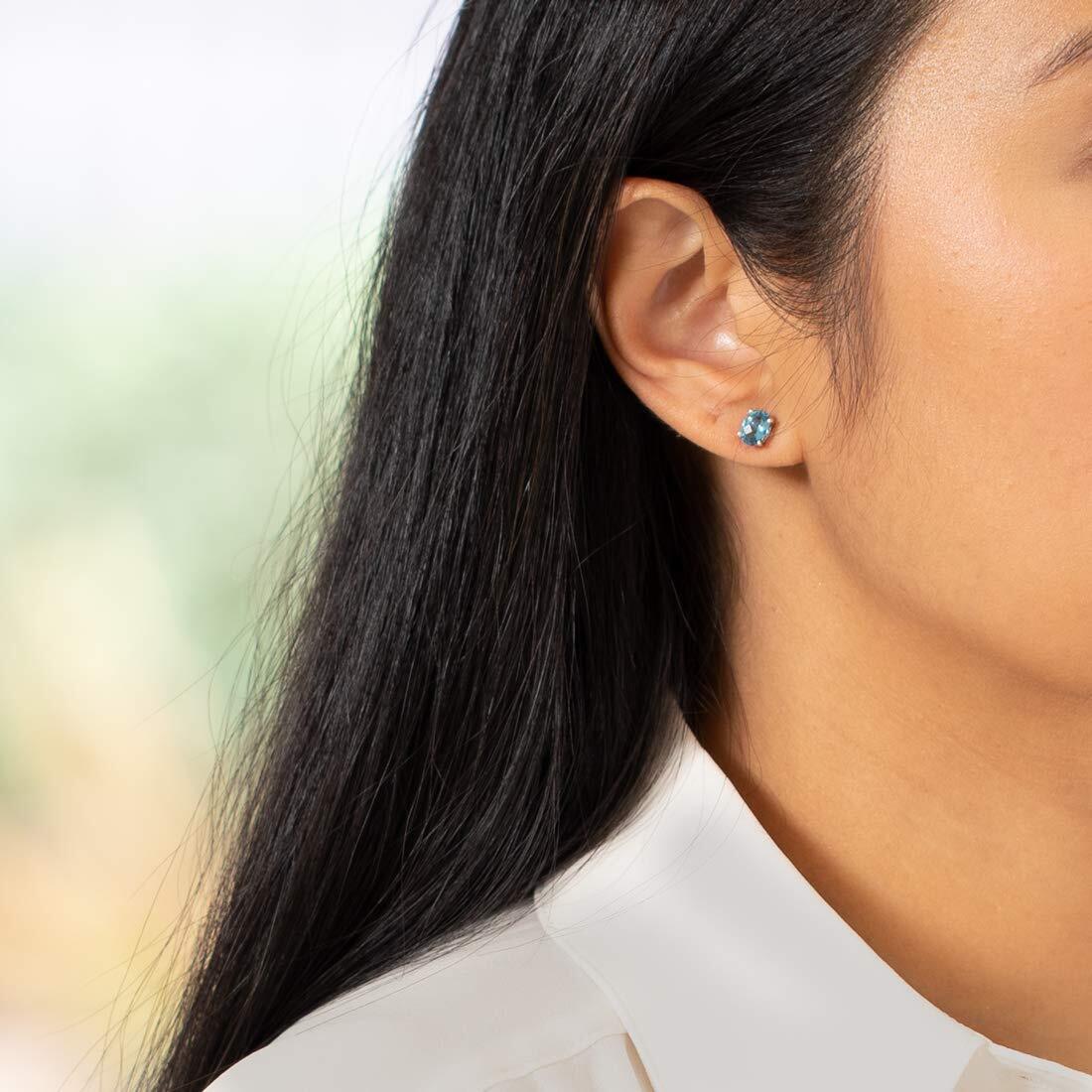 These classic earrings feature oval shape Peora natural swiss blue topaz gemstones in 14K white gold.