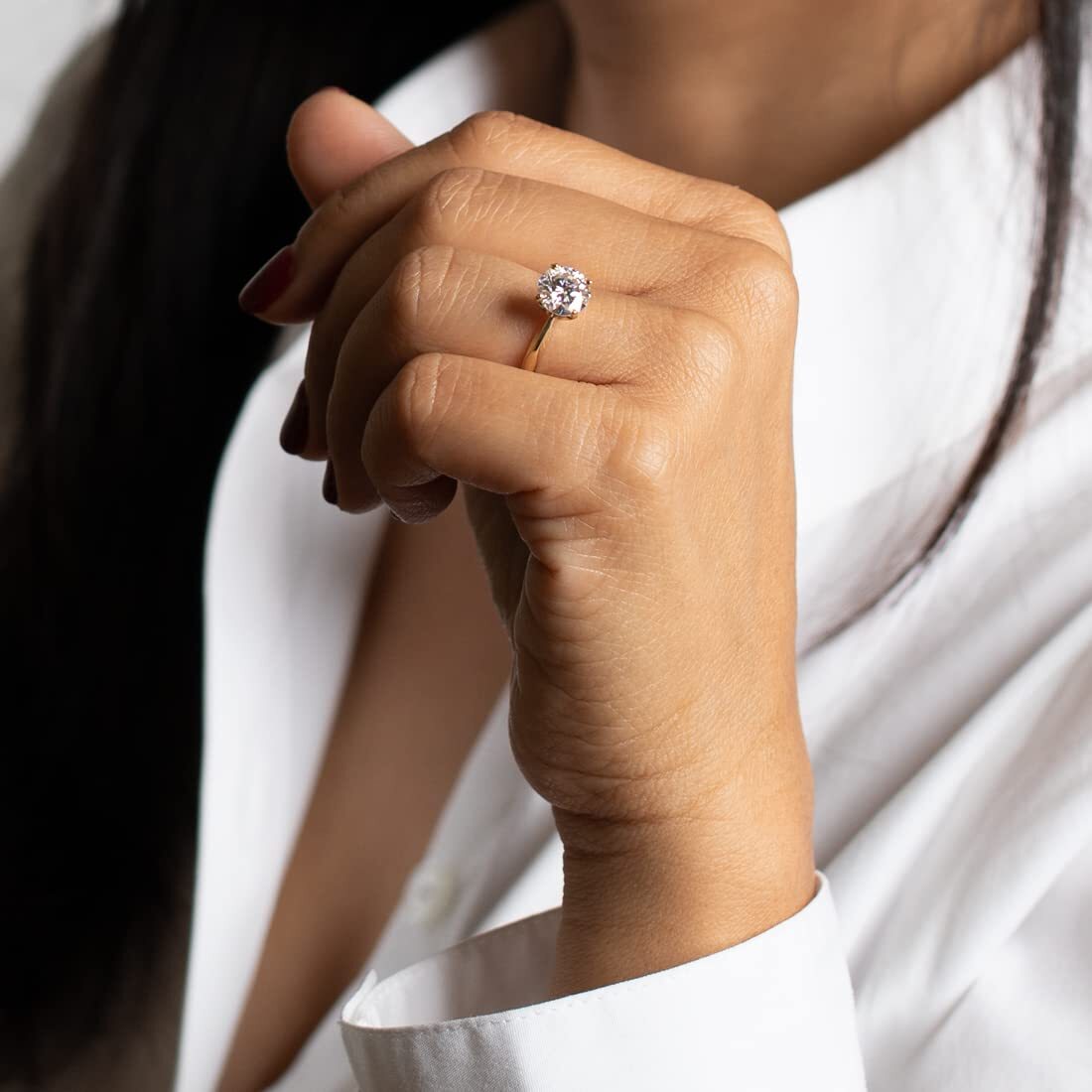No one will be able to tell it's not a diamond. Pair the everyday engagement ring with your favorite work outfit and leave the house with peace of mind.