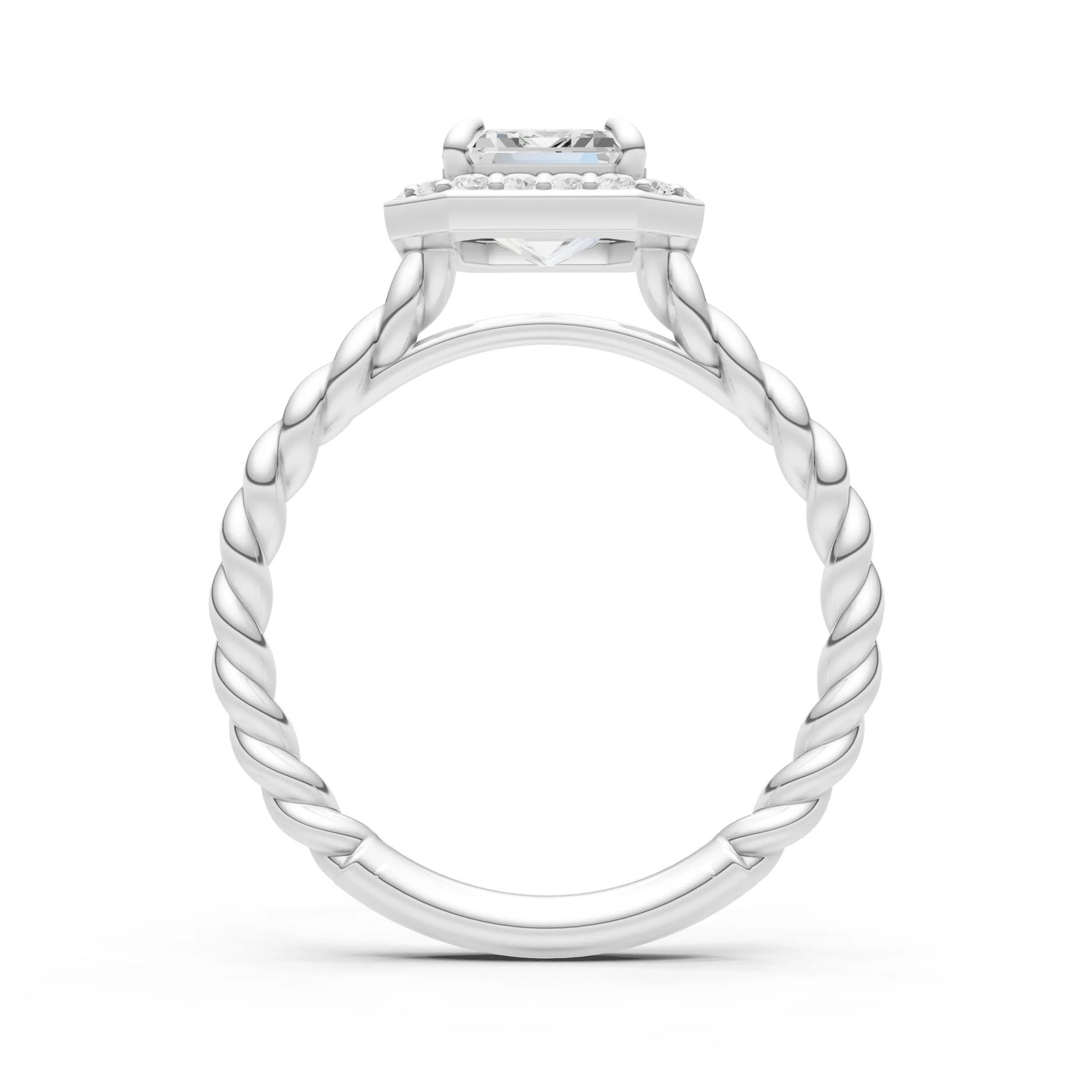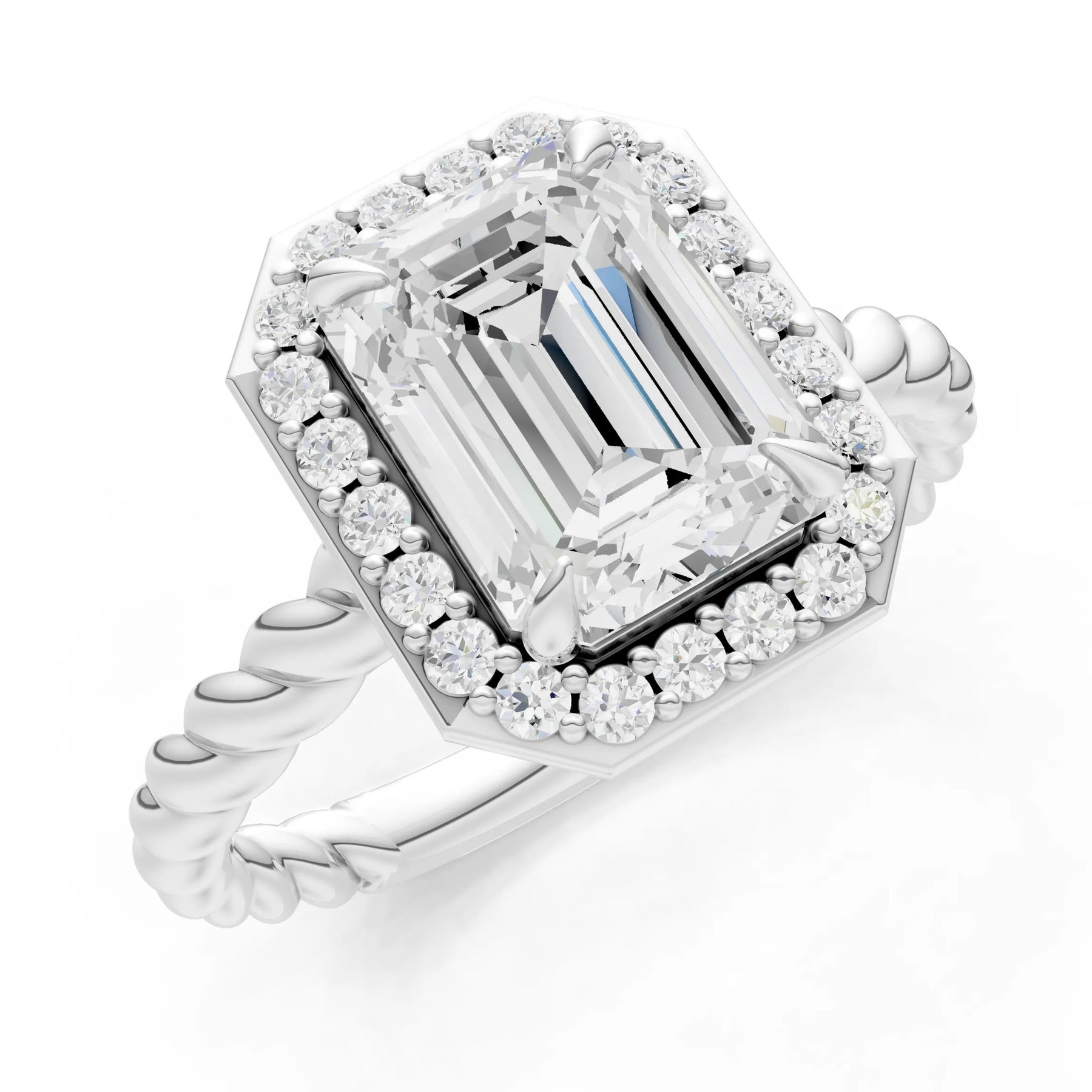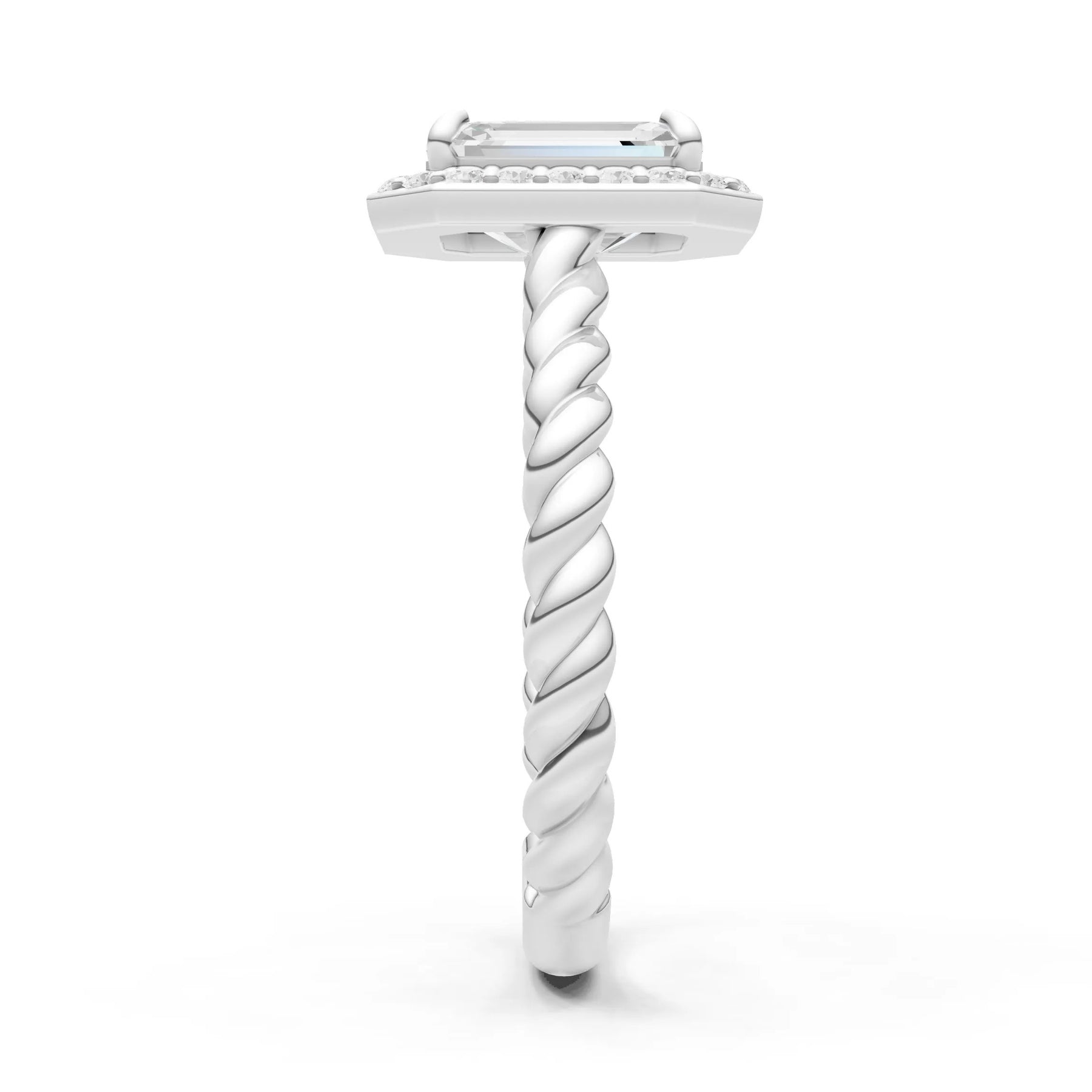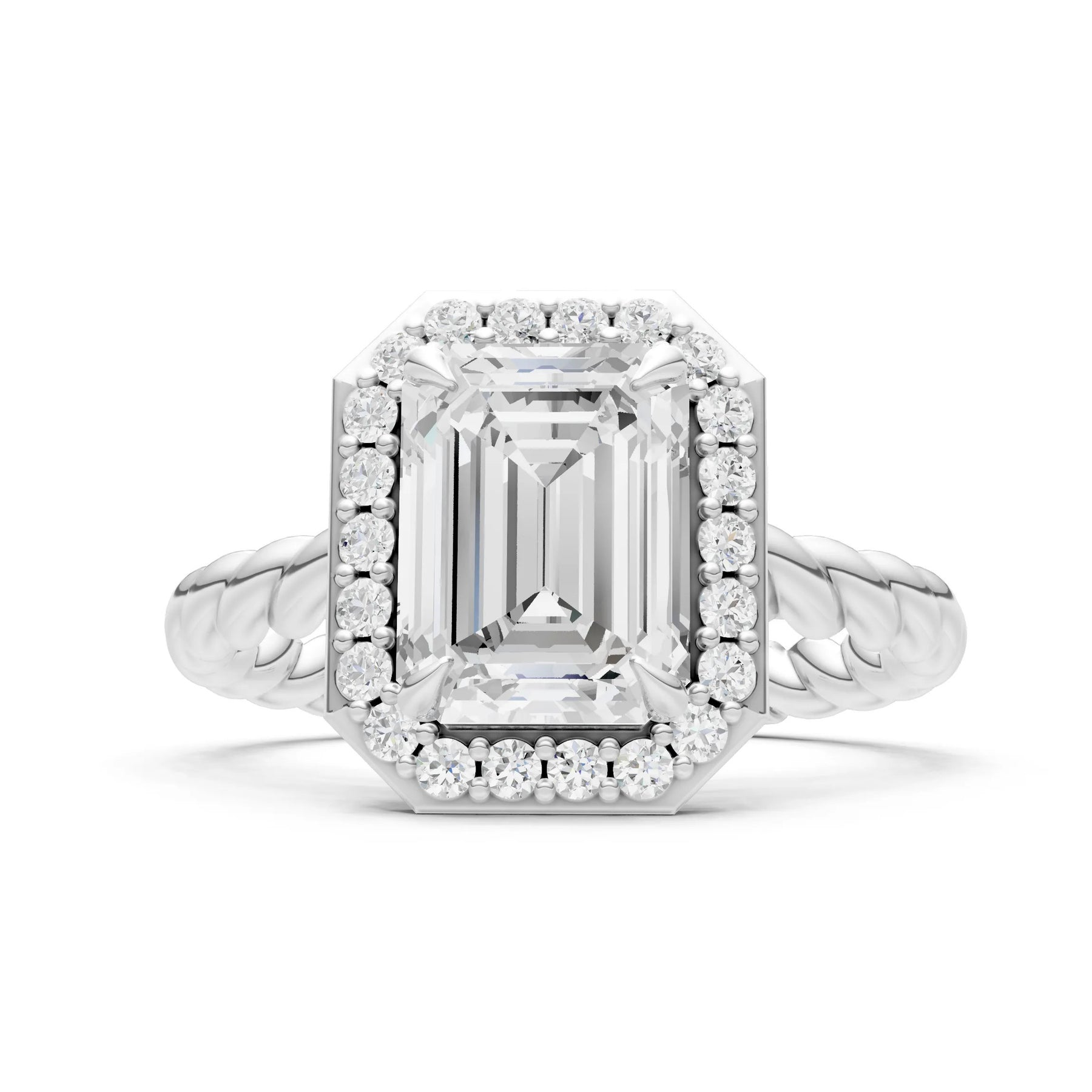 Moissanite Twisted Vine Emerald Cut Solitaire Halo Ring