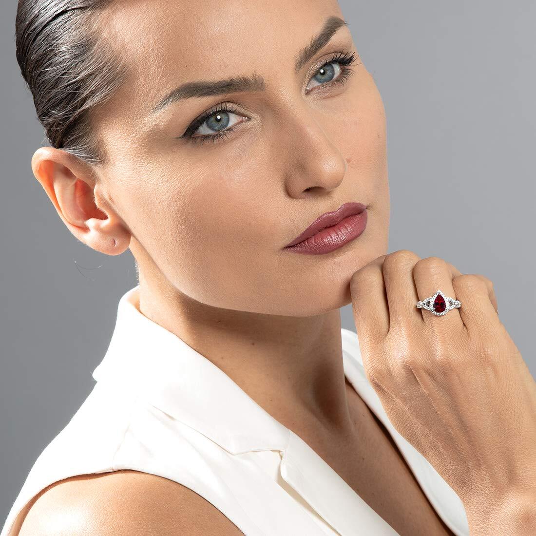 This graceful ring features a pear shape Peora created Ruby gemstone in .925 sterling silver.
