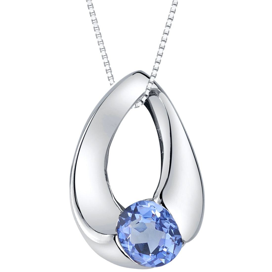 This standout pendant features a round shape Peora simulated Tanzanite gemstone in .925 sterling silver.