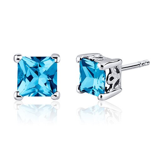 Swiss Blue Topaz Stud Earrings Sterling Silver Princess Cut
